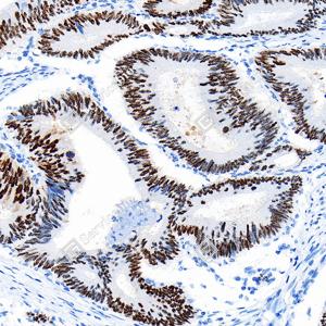 | IHC检测p53蛋白(货号 GB151740). 样品: 人结肠癌, 4%多聚甲醛 (货号G1101) 固定12-24小时. 抗原修复: Tris-EDTA抗原修复液(pH 9.0) (G1203), 100℃, 25分钟. —抗: 1: 1500稀释, 4℃ 孵育过夜. 二抗: S-vision免疫组化多聚二抗(山羊抗小鼠), 即用型(货号G1301), 室温孵育20分钟. |