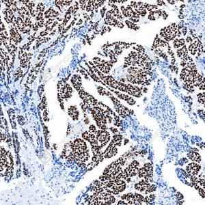 | IHC检测p53蛋白(货号 GB151740). 样品: 人卵巢癌, 4%多聚甲醛 (货号G1101) 固定12-24小时. 抗原修复: Tris-EDTA抗原修复液(pH 9.0) (G1203), 100℃, 25分钟. —抗: 1: 1500稀释, 4℃ 孵育过夜. 二抗: S-vision免疫组化多聚二抗(山羊抗小鼠), 即用型(货号G1301), 室温孵育20分钟. |