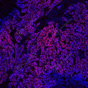 | IF检测p53蛋白(货号 GB151740)(红色). 样品: 人卵巢癌, 4%多聚甲醛 (货号G1101) 固定12-24小时. 抗原修复: Tris-EDTA抗原修复液(pH 9.0) (G1203), 100℃, 25分钟. 封闭: 3% BSA(货号GC305010)的PBS溶液, 室温孵育30分钟. —抗: 1: 1500稀释, 4℃ 孵育过夜. 二抗: Cy3标记山羊抗小鼠IgG (H+L) (货号GB21301), 1: 300稀释, 室温孵育1小时. |
