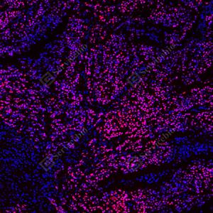 | IF检测p53蛋白(货号 GB151740)(红色). 样品: 人食管癌, 4%多聚甲醛 (货号G1101) 固定12-24小时. 抗原修复: Tris-EDTA抗原修复液(pH 9.0) (G1203), 100℃, 25分钟. 封闭: 3% BSA(货号GC305010)的PBS溶液, 室温孵育30分钟. —抗: 1: 1500稀释, 4℃ 孵育过夜. 二抗: Cy3标记山羊抗小鼠IgG (H+L) (货号GB21301), 1: 300稀释, 室温孵育1小时. |