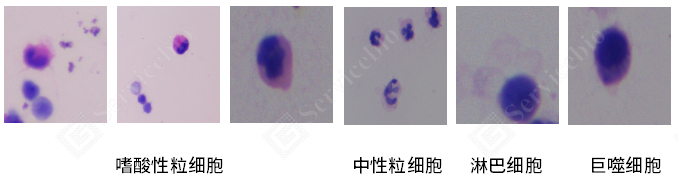 淋巴细胞 | 细胞较小,核蓝色小而圆;细胞质较少呈蓝紫色 |