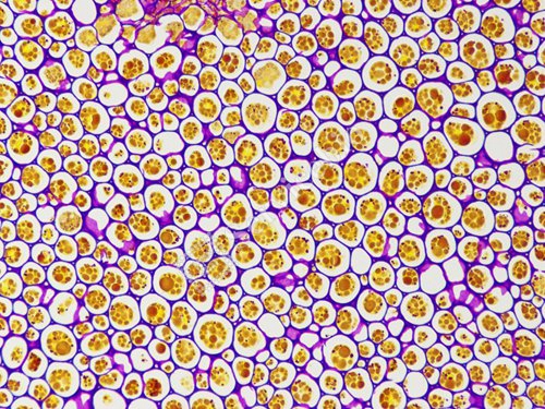 PAS+萘酚黄S染色,石蜡切片技术里用以观察植物组织中淀粉纤维素等糖类成分的分布,以及一些蛋白的分布和含量的检测。淀粉粒呈紫红色颗粒,细胞壁呈紫红色,蛋白质呈黄色