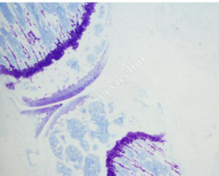 甲苯胺蓝染色又称为TB染色,它能够清楚地显示软骨形态潮线等结构,观察软骨组织是否有损伤。能将组织内的肥大细胞清晰地显示出来,便于观察肥大细胞的数量分布变化情况及观察肥大细胞是否有脱颗粒现象。尼氏体的化学成分是一种含有铁质的核酸蛋白,是神经元内合成蛋白质的主要部位,当神经元受刺激后,胞体内的尼氏体即显著减少甚至消失。尼氏体的存在和消失反应神经细胞是否受损害。当神经元受到严重损害时,尼氏体就溶解而消失,最后神经元坏死。