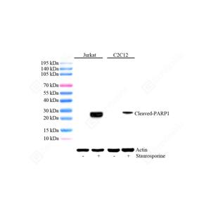 PARP1 (poly(ADP-ribose) polymerase 1) is a nuclear enzyme catalyzing the poly(ADP-ribosyl)ation of many key proteins in vivo. The normal function of PARP1 is the routine repair of DNA damage. The appearance of PARP fragments is commonly considered as an important biomarker of apoptosis.