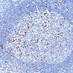 IHC检测Cleaved PARP1蛋白(货号 GB151503). 样品: 人扁桃体, 4%多聚甲醛 (货号G1101) 固定12-24小时. 抗原修复: 柠檬酸抗原修复液(干粉, pH 6.0) (G1201), 高压锅均匀喷气计时2分钟. —抗: 1: 250稀释, 4℃ 孵育过夜. 二抗: S-vision免疫组化多聚二抗(山羊抗兔),即用型 (货号G1302), 室温孵育20分钟. |