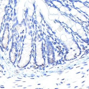 IHC检测Cleaved PARP1蛋白(货号 GB151503). 样品: 大鼠结肠, 4%多聚甲醛 (货号G1101) 固定12-24小时. 抗原修复: 柠檬酸抗原修复液(干粉, pH 6.0) (G1201), 高压锅均匀喷气计时2分钟. —抗: 1: 250稀释, 4℃ 孵育过夜. 二抗: S-vision免疫组化多聚二抗(山羊抗兔),即用型 (货号G1302), 室温孵育20分钟. |