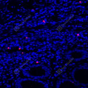 IF检测Cleaved PARP1蛋白(货号 GB151503)(红色). 样品: 人结肠, 4%多聚甲醛 (货号G1101) 固定12-24小时. 抗原修复: 柠檬酸抗原修复液(干粉, pH 6.0) (G1201), 高压锅均匀喷气计时2分钟. 封闭: 3% BSA(货号GC305010)的PBS溶液, 室温孵育30分钟. —抗: 1: 250稀释, 4℃ 孵育过夜. 二抗: Cy3标记山羊抗兔IgG (H+L) (货号GB21303), 1: 300稀释, 室温孵育1小时. |