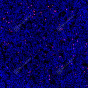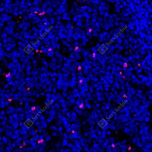 IF检测Cleaved PARP1蛋白(货号 GB151503)(红色). 样品: 人扁桃体, 4%多聚甲醛 (货号G1101) 固定12-24小时. 抗原修复: 柠檬酸抗原修复液(干粉, pH 6.0) (G1201), 高压锅均匀喷气计时2分钟. 封闭: 3% BSA(货号GC305010)的PBS溶液, 室温孵育30分钟. —抗: 1: 250稀释, 4℃ 孵育过夜. 二抗: Cy3标记山羊抗兔IgG (H+L) (货号GB21303), 1: 300稀释, 室温孵育1小时. |