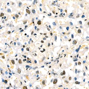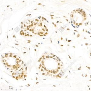 | IHC检测Topoisomerase II alpha蛋白(货号 GB111293). 样品: 人乳腺癌, 4%多聚甲醛 (货号G1101) 固定12-24小时. 抗原修复: 柠檬酸抗原修复液(干粉, pH 6.0) (G1201), 98℃, 20分钟. —抗: 1: 1500稀释, 4℃ 孵育过夜. 二抗: HRP标记山羊抗兔IgG (H+L) (货号GB23303), 1: 200稀释, 室温孵育1小时. |