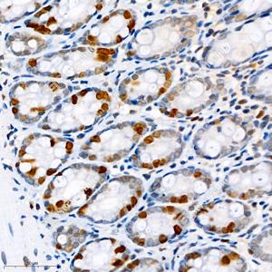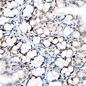 | IHC检测Topoisomerase II alpha蛋白(货号 GB111293). 样品: 小鼠结肠, 4%多聚甲醛 (货号G1101) 固定12-24小时. 抗原修复: 柠檬酸抗原修复液(干粉, pH 6.0) (G1201), 98℃, 20分钟. —抗: 1: 1500稀释, 4℃ 孵育过夜. 二抗: HRP标记山羊抗兔IgG (H+L) (货号GB23303), 1: 200稀释, 室温孵育1小时. |