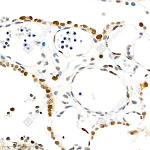 | IHC检测Topoisomerase II alpha蛋白(货号 GB111293). 样品: 大鼠胎盘, 4%多聚甲醛 (货号G1101) 固定12-24小时. 抗原修复: 柠檬酸抗原修复液(干粉, pH 6.0) (G1201), 98℃, 20分钟. —抗: 1: 1500稀释, 4℃ 孵育过夜. 二抗: HRP标记山羊抗兔IgG (H+L) (货号GB23303), 1: 200稀释, 室温孵育1小时. |
