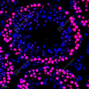 | IF检测Topoisomerase II alpha蛋白(货号 GB111293)(红色). 样品: 小鼠睾丸, 4%多聚甲醛 (货号G1101) 固定12-24小时. 抗原修复: Tris-EDTA抗原修复液(pH 9.0) (G1203), 98℃, 20分钟. 封闭: 3% BSA(货号GC305010)的PBS溶液, 室温孵育30分钟. —抗: 1: 1500稀释, 4℃ 孵育过夜. 二抗: Cy3标记山羊抗兔IgG (H+L) (货号GB21303), 1: 300稀释, 室温孵育1小时. |