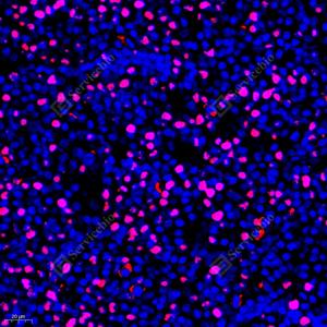 | IF检测Topoisomerase II alpha蛋白(货号 GB111293)(红色). 样品: 小鼠脑, 4%多聚甲醛 (货号G1101) 固定12-24小时. 抗原修复: Tris-EDTA抗原修复液(pH 9.0) (G1203), 98℃, 20分钟. 封闭: 3% BSA(货号GC305010)的PBS溶液, 室温孵育30分钟. —抗: 1: 1500稀释, 4℃ 孵育过夜. 二抗: Cy3标记山羊抗兔IgG (H+L) (货号GB21303), 1: 300稀释, 室温孵育1小时. |