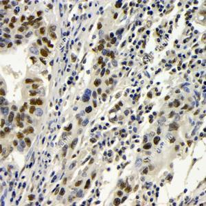 IHC检测BRCA1蛋白(货号 GB115539). 样品: 人胃癌, 4%多聚甲醛 (货号G1101) 固定12-24小时. 抗原修复: Tris-EDTA抗原修复液(pH 9.0) (G1203), 98℃, 20分钟. —抗: 1: 100稀释, 4℃ 孵育过夜. 二抗: HRP标记山羊抗兔IgG (H+L) (货号GB23303), 1: 200稀释, 室温孵育1小时. |