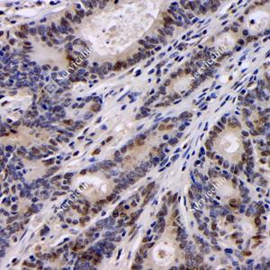 IHC检测BRCA1蛋白(货号 GB115539). 样品: 人结肠, 4%多聚甲醛 (货号G1101) 固定12-24小时. 抗原修复: Tris-EDTA抗原修复液(pH 9.0) (G1203), 98℃, 20分钟. —抗: 1: 100稀释, 4℃ 孵育过夜. 二抗: HRP标记山羊抗兔IgG (H+L) (货号GB23303), 1: 200稀释, 室温孵育1小时. |