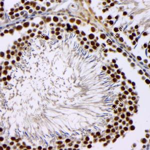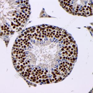 IHC检测BRCA1蛋白(货号 GB115539). 样品: 小鼠睾丸, 4%多聚甲醛 (货号G1101) 固定12-24小时. 抗原修复: Tris-EDTA抗原修复液(pH 9.0) (G1203), 98℃, 20分钟. —抗: 1: 100稀释, 4℃ 孵育过夜. 二抗: HRP标记山羊抗兔IgG (H+L) (货号GB23303), 1: 200稀释, 室温孵育1小时. |