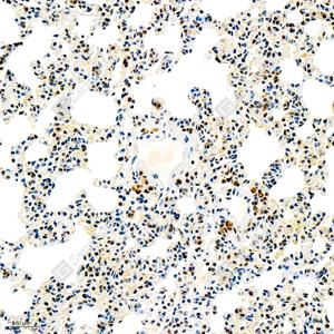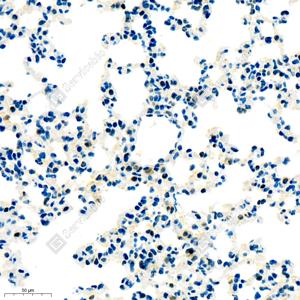 IHC检测Rad50蛋白(货号 GB11974). 样品: 小鼠肺, 4%多聚甲醛 (货号G1101) 固定12-24小时. 抗原修复: 柠檬酸抗原修复液(干粉, pH 6.0) (G1201), 98℃, 20分钟. —抗: 1: 1600稀释, 4℃ 孵育过夜. 二抗: HRP标记山羊抗兔IgG (H+L) (货号GB23303), 1: 200稀释, 室温孵育1小时. |