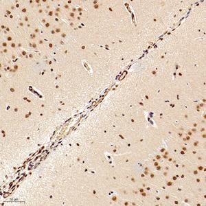 IHC检测Rad50蛋白(货号 GB11974). 样品: 大鼠纹状体, 4%多聚甲醛 (货号G1101) 固定12-24小时. 抗原修复: 柠檬酸抗原修复液(干粉, pH 6.0) (G1201), 98℃, 20分钟. —抗: 1: 500稀释, 4℃ 孵育过夜. 二抗: HRP标记山羊抗兔IgG (H+L) (货号GB23303), 1: 200稀释, 室温孵育1小时. |