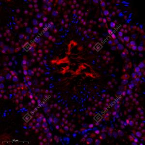 IF检测Rad50蛋白(货号 GB11974)(红色). 样品: 小鼠睾丸, 4%多聚甲醛 (货号G1101) 固定12-24小时. 抗原修复: Tris-EDTA抗原修复液(pH 9.0) (G1203), 98℃, 20分钟. 封闭: 3% BSA(货号GC305010)的PBS溶液, 室温孵育30分钟. —抗: 1: 500稀释, 4℃ 孵育过夜. 二抗: Cy3标记山羊抗兔IgG (H+L) (货号GB21303), 1: 300稀释, 室温孵育1小时. |