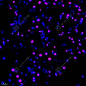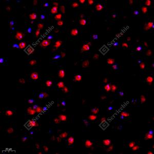 IF检测TLS/FUS蛋白(货号 GB111365)(红色). 样品: 小鼠脑, 4%多聚甲醛 (货号G1101) 固定12-24小时. 抗原修复: Tris-EDTA抗原修复液(pH 9.0) (G1203), 98℃, 20分钟. 封闭: 3% BSA(货号GC305010)的PBS溶液, 室温孵育30分钟. —抗: 1: 1000稀释, 4℃ 孵育过夜. 二抗: Cy3标记山羊抗兔IgG (H+L) (货号GB21303), 1: 300稀释, 室温孵育1小时. |