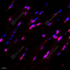 IF检测TLS/FUS蛋白(货号 GB111365)(红色). 样品: 小鼠骨骼肌, 4%多聚甲醛 (货号G1101) 固定12-24小时. 抗原修复: Tris-EDTA抗原修复液(pH 9.0) (G1203), 98℃, 20分钟. 封闭: 3% BSA(货号GC305010)的PBS溶液, 室温孵育30分钟. —抗: 1: 1000稀释, 4℃ 孵育过夜. 二抗: Cy3标记山羊抗兔IgG (H+L) (货号GB21303), 1: 300稀释, 室温孵育1小时. |