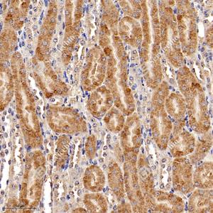 IHC检测FLAP蛋白(货号 GB115057). 样品: 小鼠肾, 4%多聚甲醛 (货号G1101) 固定12-24小时. 抗原修复: Tris-EDTA抗原修复液(pH 9.0) (G1203), 98℃, 20分钟. —抗: 1: 600稀释, 4℃ 孵育过夜. 二抗: HRP标记山羊抗兔IgG (H+L) (货号GB23303), 1: 200稀释, 室温孵育1小时. |