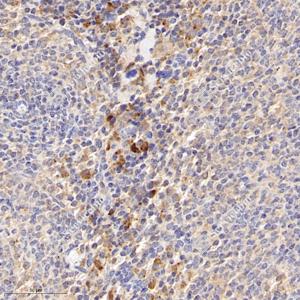 IHC检测FLAP蛋白(货号 GB115057). 样品: 小鼠脾, 4%多聚甲醛 (货号G1101) 固定12-24小时. 抗原修复: Tris-EDTA抗原修复液(pH 9.0) (G1203), 98℃, 20分钟. —抗: 1: 600稀释, 4℃ 孵育过夜. 二抗: HRP标记山羊抗兔IgG (H+L) (货号GB23303), 1: 200稀释, 室温孵育1小时. |