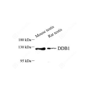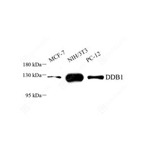 WB检测DDB1蛋白(货号 GB112062). 样品: 经RIPA裂解液(货号G2002)处理的蛋白质. 封闭: 封闭: 3%脱脂牛奶(货号GC310001)溶于TBST溶液, 室温孵育1小时. —抗: 1: 500稀释, 4℃ 孵育过夜. 二抗: HRP标记山羊抗兔IgG (H+L) (货号GB23303), 1: 5000稀释, 室温孵育1小时. |