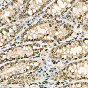 IHC检测GADD45A蛋白(货号 GB11576). 样品: 大鼠结肠, 4%多聚甲醛 (货号G1101) 固定12-24小时. 抗原修复: 柠檬酸抗原修复液(干粉, pH 6.0) (G1201), 98℃, 20分钟. —抗: 1: 1500稀释, 4℃ 孵育过夜. 二抗: HRP标记山羊抗兔IgG (H+L) (货号GB23303), 1: 200稀释, 室温孵育1小时. |