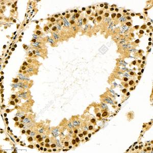 IHC检测GADD45A蛋白(货号 GB11576). 样品: 大鼠睾丸, 4%多聚甲醛 (货号G1101) 固定12-24小时. 抗原修复: 柠檬酸抗原修复液(干粉, pH 6.0) (G1201), 98℃, 20分钟. —抗: 1: 1500稀释, 4℃ 孵育过夜. 二抗: HRP标记山羊抗兔IgG (H+L) (货号GB23303), 1: 200稀释, 室温孵育1小时. |