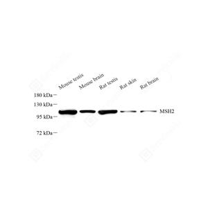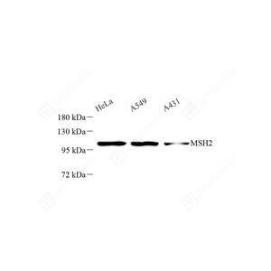 WB检测MSH2蛋白(货号 GB113283). 样品: 经RIPA裂解液(货号G2002)处理的蛋白质. 封闭: 封闭: 3%脱脂牛奶(货号GC310001)溶于TBST溶液, 室温孵育1小时. —抗: 1: 1000稀释, 4℃ 孵育过夜. 二抗: HRP标记山羊抗兔IgG (H+L) (货号GB23303), 1: 5000稀释, 室温孵育1小时. |