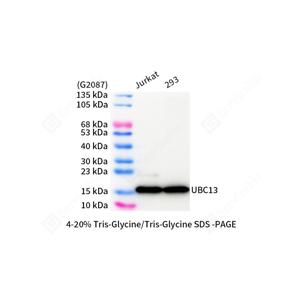 | WB检测Ube2N/Ubc13蛋白(货号 GB150156). 样品: 经RIPA裂解液(货号G2002)处理的蛋白质. 封闭: 3%脱脂牛奶(货号GC310001)溶于TBST溶液, 室温孵育1小时. —抗: 1: 500稀释, 4℃ 孵育过夜. 二抗: HRP标记山羊抗小鼠IgG (H+L) (货号GB23301), 1: 5000稀释, 室温孵育1小时. |