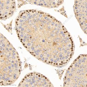 IHC检测ATPase MORC2蛋白(货号 GB111662). 样品: 小鼠睾丸, 4%多聚甲醛 (货号G1101) 固定12-24小时. 抗原修复: 柠檬酸抗原修复液(干粉, pH 6.0) (G1201), 98℃, 20分钟. —抗: 1: 1000稀释, 4℃ 孵育过夜. 二抗: HRP标记山羊抗兔IgG (H+L) (货号GB23303), 1: 200稀释, 室温孵育1小时. |