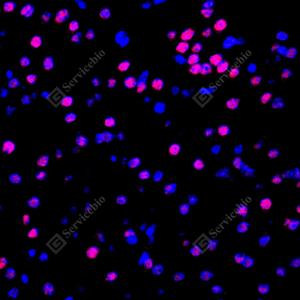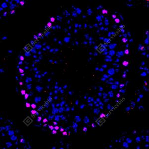 IF检测ATPase MORC2蛋白(货号 GB111662)(红色). 样品: 小鼠睾丸, 4%多聚甲醛 (货号G1101) 固定12-24小时. 抗原修复: Tris-EDTA抗原修复液(pH 9.0) (G1203), 98℃, 20分钟. 封闭: 3% BSA(货号GC305010)的PBS溶液, 室温孵育30分钟. —抗: 1: 1000稀释, 4℃ 孵育过夜. 二抗: Cy3标记山羊抗兔IgG (H+L) (货号GB21303), 1: 300稀释, 室温孵育1小时. |