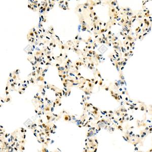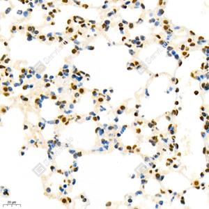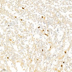 IHC检测BAAT1蛋白(货号 GB11772). 样品: 小鼠肺, 4%多聚甲醛 (货号G1101) 固定12-24小时. 抗原修复: 柠檬酸抗原修复液(干粉, pH 6.0) (G1201), 98℃, 20分钟. —抗: 1: 3000稀释, 4℃ 孵育过夜. 二抗: HRP标记山羊抗兔IgG (H+L) (货号GB23303), 1: 200稀释, 室温孵育1小时. |