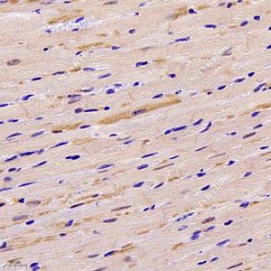 IHC检测NEIL1蛋白(货号 GB112581). 样品: 小鼠心, 4%多聚甲醛 (货号G1101) 固定12-24小时. 抗原修复: 柠檬酸抗原修复液(干粉, pH 6.0) (G1201), 98℃, 20分钟. —抗: 1: 1200稀释, 4℃ 孵育过夜. 二抗: HRP标记山羊抗兔IgG (H+L) (货号GB23303), 1: 200稀释, 室温孵育1小时. |