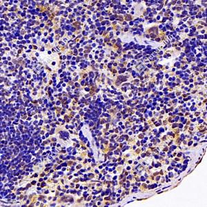 IHC检测NEIL1蛋白(货号 GB112581). 样品: 小鼠脾, 4%多聚甲醛 (货号G1101) 固定12-24小时. 抗原修复: 柠檬酸抗原修复液(干粉, pH 6.0) (G1201), 98℃, 20分钟. —抗: 1: 1200稀释, 4℃ 孵育过夜. 二抗: HRP标记山羊抗兔IgG (H+L) (货号GB23303), 1: 200稀释, 室温孵育1小时. |