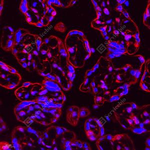 IF检测NEIL1蛋白(货号 GB112581)(红色). 样品: 人胎盘, 4%多聚甲醛 (货号G1101) 固定12-24小时. 抗原修复: Tris-EDTA抗原修复液(pH 9.0) (G1203), 98℃, 20分钟. 封闭: 3% BSA(货号GC305010)的PBS溶液, 室温孵育30分钟. —抗: 1: 300稀释, 4℃ 孵育过夜. 二抗: Cy3标记山羊抗兔IgG (H+L) (货号GB21303), 1: 300稀释, 室温孵育1小时. |