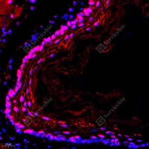 IF检测NEIL1蛋白(货号 GB112581)(红色). 样品: 小鼠食管, 4%多聚甲醛 (货号G1101) 固定12-24小时. 抗原修复: Tris-EDTA抗原修复液(pH 9.0) (G1203), 98℃, 20分钟. 封闭: 3% BSA(货号GC305010)的PBS溶液, 室温孵育30分钟. —抗: 1: 300稀释, 4℃ 孵育过夜. 二抗: Cy3标记山羊抗兔IgG (H+L) (货号GB21303), 1: 300稀释, 室温孵育1小时. |