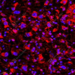 IF检测NEIL1蛋白(货号 GB112581)(红色). 样品: 人食管癌, 4%多聚甲醛 (货号G1101) 固定12-24小时. 抗原修复: Tris-EDTA抗原修复液(pH 9.0) (G1203), 98℃, 20分钟. 封闭: 3% BSA(货号GC305010)的PBS溶液, 室温孵育30分钟. —抗: 1: 300稀释, 4℃ 孵育过夜. 二抗: Cy3标记山羊抗兔IgG (H+L) (货号GB21303), 1: 300稀释, 室温孵育1小时. |