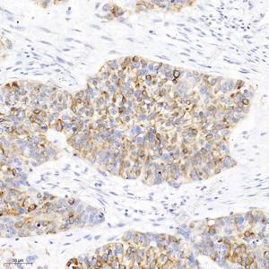IHC检测PDRG1蛋白(货号 GB111733). 样品: 人肺癌, 4%多聚甲醛 (货号G1101) 固定12-24小时. 抗原修复: 柠檬酸抗原修复液(干粉, pH 6.0) (G1201), 98℃, 20分钟. —抗: 1: 300稀释, 4℃ 孵育过夜. 二抗: HRP标记山羊抗兔IgG (H+L) (货号GB23303), 1: 200稀释, 室温孵育1小时. |