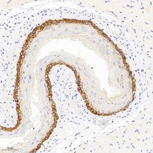 IHC检测PDRG1蛋白(货号 GB111733). 样品: 小鼠食管, 4%多聚甲醛 (货号G1101) 固定12-24小时. 抗原修复: 柠檬酸抗原修复液(干粉, pH 6.0) (G1201), 98℃, 20分钟. —抗: 1: 300稀释, 4℃ 孵育过夜. 二抗: HRP标记山羊抗兔IgG (H+L) (货号GB23303), 1: 200稀释, 室温孵育1小时. |
