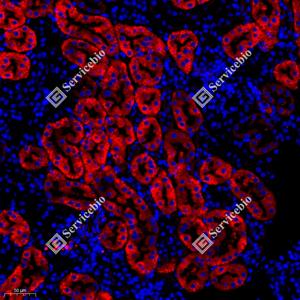 IHC检测PDRG1蛋白(货号 GB111733). 样品: 小鼠肾, 4%多聚甲醛 (货号G1101) 固定12-24小时. 抗原修复: 柠檬酸抗原修复液(干粉, pH 6.0) (G1201), 98℃, 20分钟. —抗: 1: 250稀释, 4℃ 孵育过夜. 二抗: HRP标记山羊抗兔IgG (H+L) (货号GB23303), 1: 200稀释, 室温孵育1小时. |