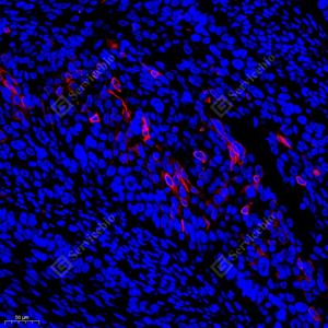 IF检测PDRG1蛋白(货号 GB111733)(红色). 样品: 人肺癌, 4%多聚甲醛 (货号G1101) 固定12-24小时. 抗原修复: Tris-EDTA抗原修复液(pH 9.0) (G1203), 98℃, 20分钟. 封闭: 3% BSA(货号GC305010)的PBS溶液, 室温孵育30分钟. —抗: 1: 300稀释, 4℃ 孵育过夜. 二抗: Cy3标记山羊抗兔IgG (H+L) (货号GB21303), 1: 300稀释, 室温孵育1小时. |