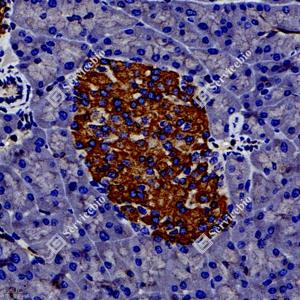 IHC检测Dicer蛋白(货号 GB11410). 样品: 小鼠胰腺, 4%多聚甲醛 (货号G1101) 固定12-24小时. 抗原修复: 柠檬酸抗原修复液(干粉, pH 6.0) (G1201), 98℃, 20分钟. —抗: 1: 1000稀释, 4℃ 孵育过夜. 二抗: HRP标记山羊抗兔IgG (H+L) (货号GB23303), 1: 200稀释, 室温孵育1小时. |