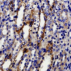 IHC检测Dicer蛋白(货号 GB11410). 样品: 人肾, 4%多聚甲醛 (货号G1101) 固定12-24小时. 抗原修复: 柠檬酸抗原修复液(干粉, pH 6.0) (G1201), 98℃, 20分钟. —抗: 1: 1000稀释, 4℃ 孵育过夜. 二抗: HRP标记山羊抗兔IgG (H+L) (货号GB23303), 1: 200稀释, 室温孵育1小时. |
