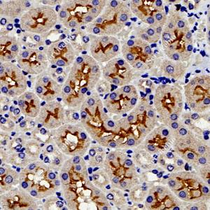 IHC检测Dicer蛋白(货号 GB11410). 样品: 小鼠肾, 4%多聚甲醛 (货号G1101) 固定12-24小时. 抗原修复: 柠檬酸抗原修复液(干粉, pH 6.0) (G1201), 98℃, 20分钟. —抗: 1: 1000稀释, 4℃ 孵育过夜. 二抗: HRP标记山羊抗兔IgG (H+L) (货号GB23303), 1: 200稀释, 室温孵育1小时. |