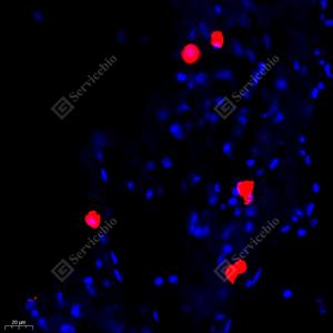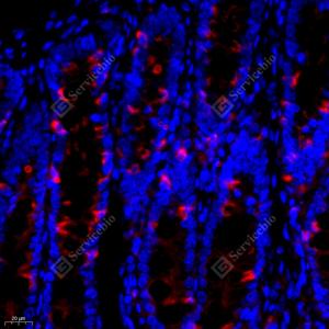 IF检测Dicer蛋白(货号 GB11410)(红色). 样品: 小鼠结肠, 4%多聚甲醛 (货号G1101) 固定12-24小时. 抗原修复: Tris-EDTA抗原修复液(pH 9.0) (G1203), 98℃, 20分钟. 封闭: 3% BSA(货号GC305010)的PBS溶液, 室温孵育30分钟. —抗: 1: 1000稀释, 4℃ 孵育过夜. 二抗: Cy3标记山羊抗兔IgG (H+L) (货号GB21303), 1: 300稀释, 室温孵育1小时. |