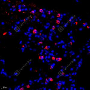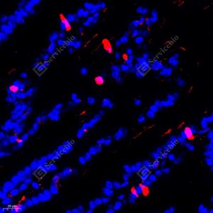 IF检测Dicer蛋白(货号 GB11410)(红色). 样品: 大鼠小肠, 4%多聚甲醛 (货号G1101) 固定12-24小时. 抗原修复: Tris-EDTA抗原修复液(pH 9.0) (G1203), 98℃, 20分钟. 封闭: 3% BSA(货号GC305010)的PBS溶液, 室温孵育30分钟. —抗: 1: 1000稀释, 4℃ 孵育过夜. 二抗: Cy3标记山羊抗兔IgG (H+L) (货号GB21303), 1: 300稀释, 室温孵育1小时. |