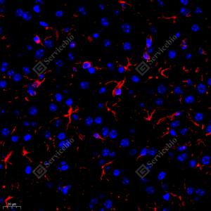 IF检测CBS蛋白(货号 GB111794)(红色). 样品: 小鼠脑, 4%多聚甲醛 (货号G1101) 固定12-24小时. 抗原修复: Tris-EDTA抗原修复液(pH 9.0) (G1203), 98℃, 20分钟. 封闭: 3% BSA(货号GC305010)的PBS溶液, 室温孵育30分钟. —抗: 1: 400稀释, 4℃ 孵育过夜. 二抗: Cy3标记山羊抗兔IgG (H+L) (货号GB21303), 1: 300稀释, 室温孵育1小时. |
